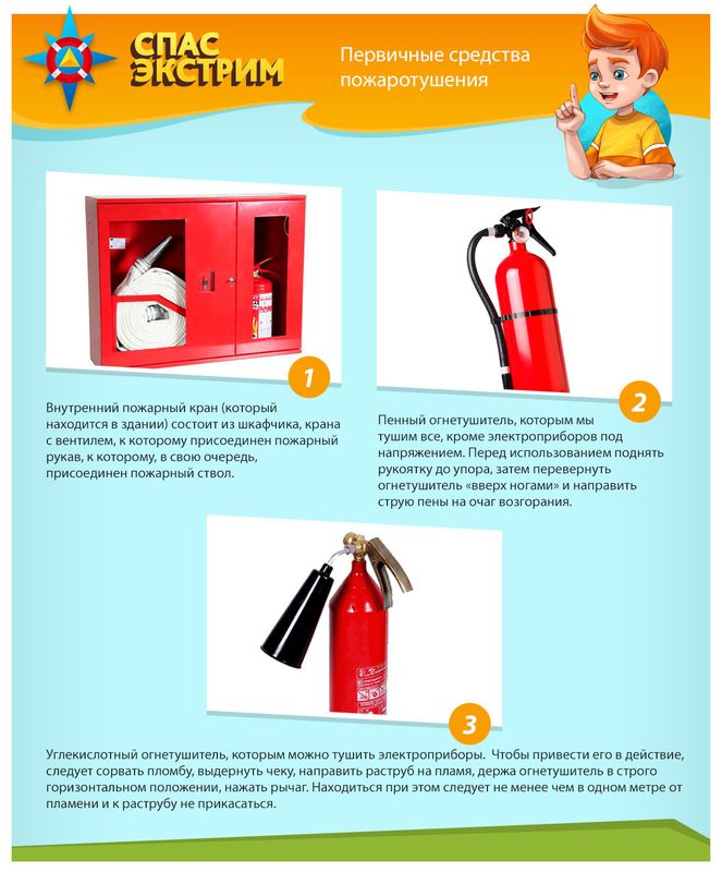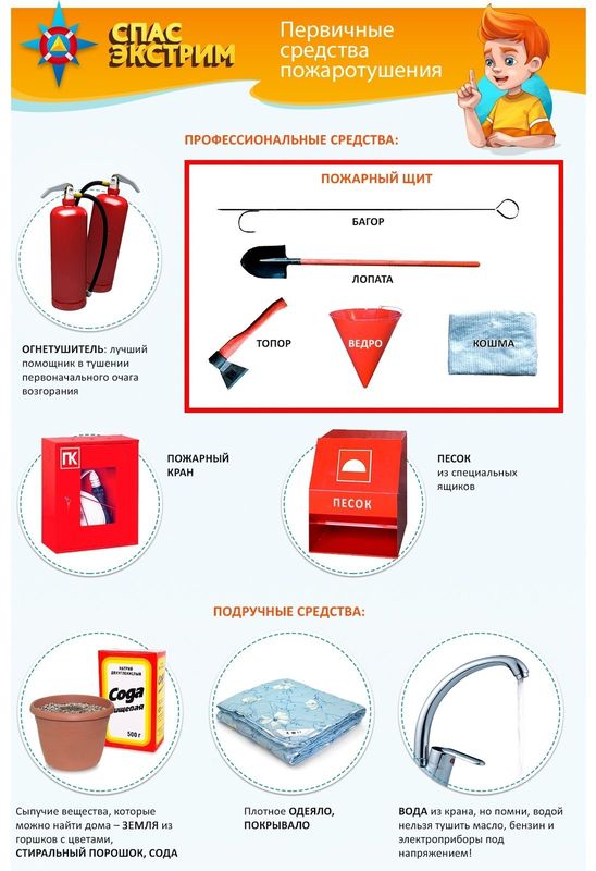 Очень важно запомнить, какие именно способы подходят для тушения тех или иных предметов, так ты сможешь быстрее сориентироваться, если окажешься в сложной ситуации. Например, если горящую мусорную корзину можно легко потушить водой, то включенный электроприбор ни в коем случае заливать водой нельзя, может произойти короткое замыкание. А горящую на человеке одежду лучше тушить, катая пострадавшего по земле – это уменьшит доступ кислорода, и огонь погаснет.